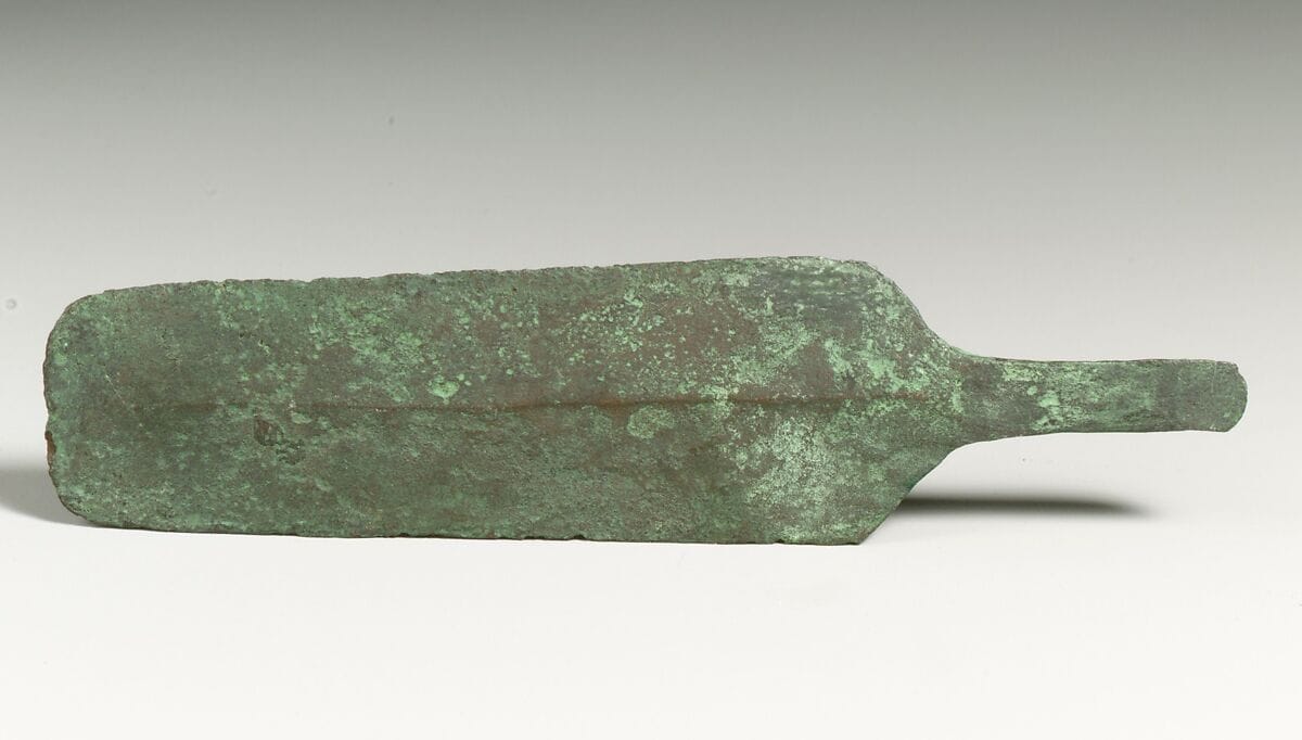 Leaf-shaped blade with tang and no rivet-holes. 4 7/8in. (12.4cm)