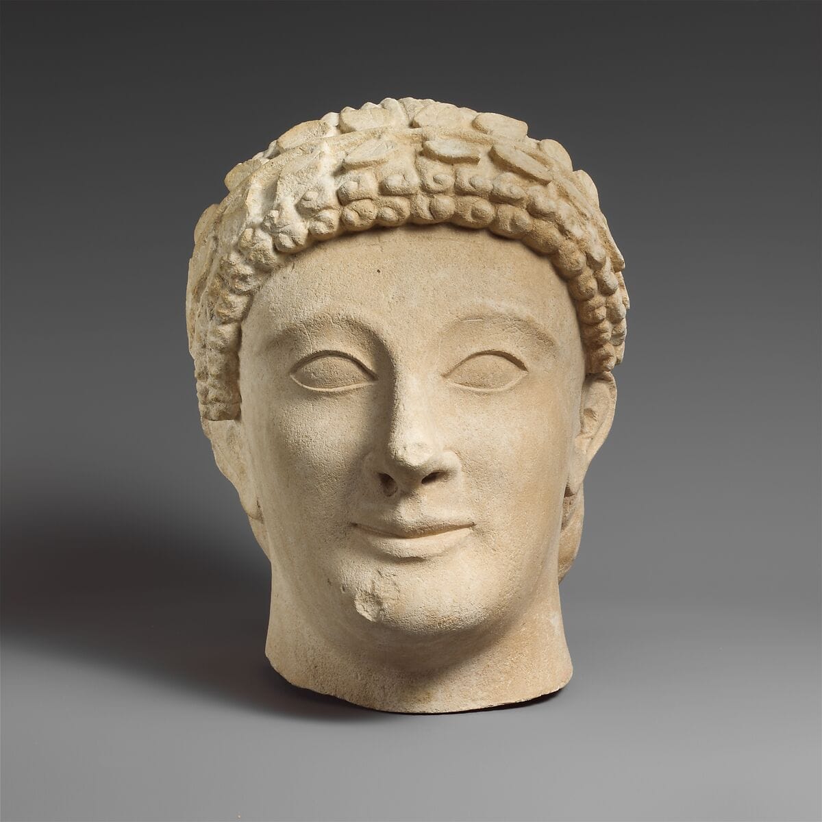Male head with wreath of leaves. Overall: 11 x 7 3/4 x 10 in. (27.9 x 19.7 x 25.4 cm)