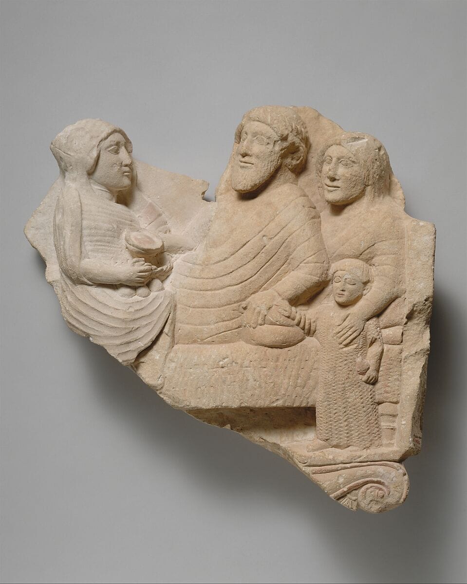 Banquet scene with a man, two women and a child. 21 × 24 1/2 × 6 1/4 in., 67.5 lb. (53.3 × 62.2 × 15.9 cm, 30.6 kg)