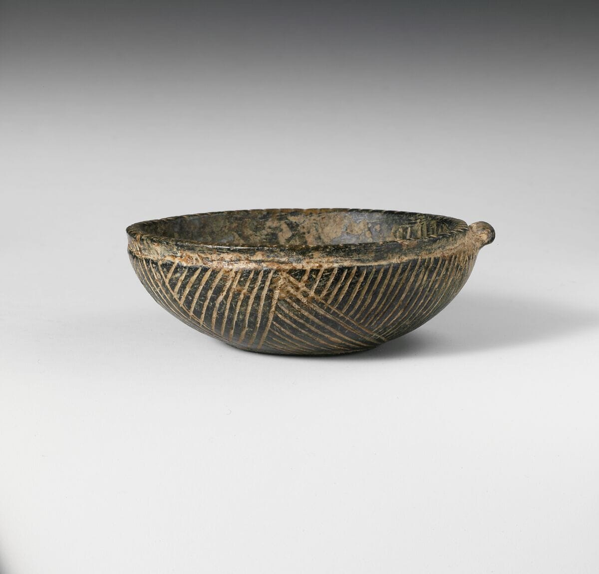 One handle, decorated with basket pattern. The bowl has a small, horizontal lug. On the exterior is a decoration of hatched triangles and there are diagonal lines inscribed on the inside lip. H.: 3/4in. (1.9cm) Diam.: 2 1/8 in. (5.4 cm)