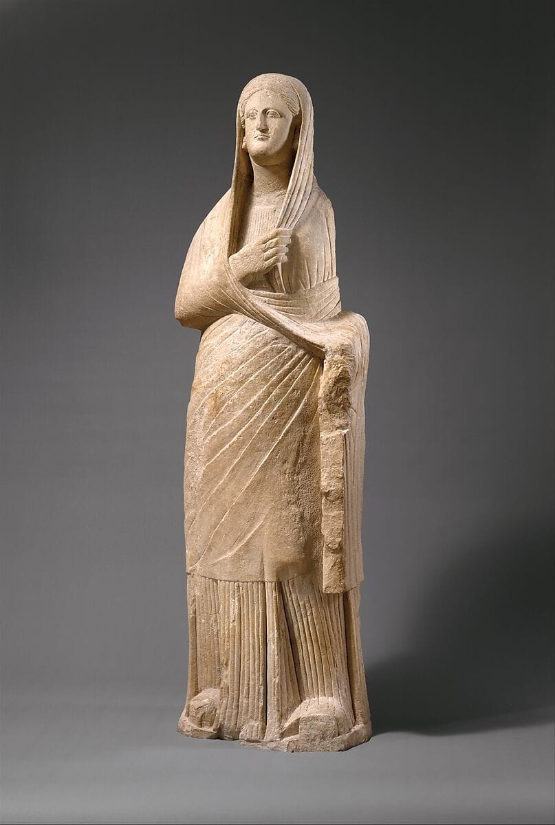 Female votary wearing tunic and cloak, the latter drawn over her head. Overall: 76 × 24 × 13 in., 856 lb. (193 × 61 × 33 cm, 388.3 kg)