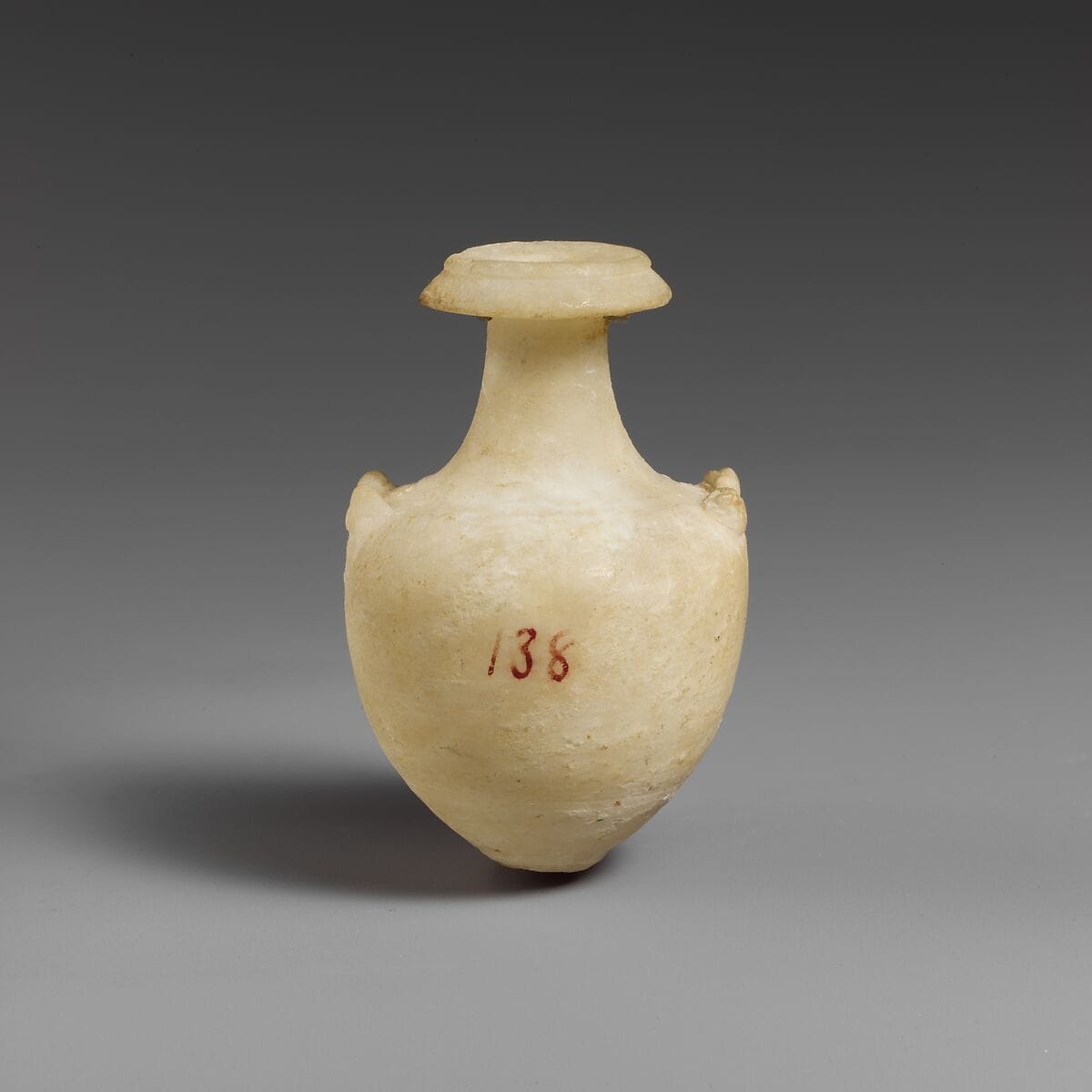 The handles are short, vertical lugs. The large mouth is articulated into two parts. H. 2 5/8 (6.7 cm); Diam. 1 11/16 in. (4.3 cm)