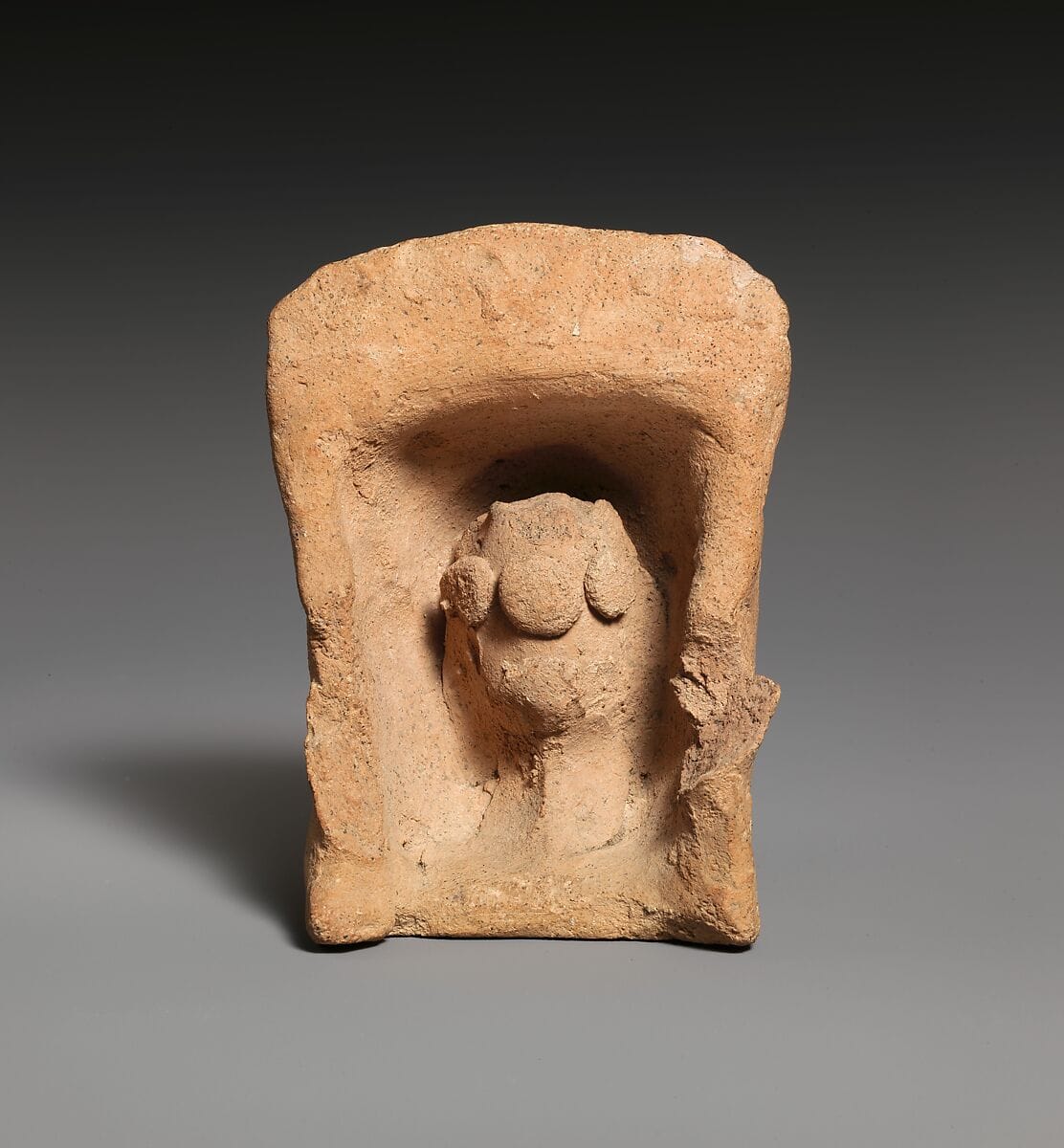 The model originally had pilasters on either side of the opening. The vertical form inside is an aniconic representation of the fertility goddess Astarte. Similar depictions are known from the Levant and Cyprus. Model shrines began to be made in Cyprus during the Chalcolithic period and, due to Phoenician influence, were produced in particular quantity during the Archaic period. All of the excavated examples come from tombs. H. 3 15/16 in. (10 cm)