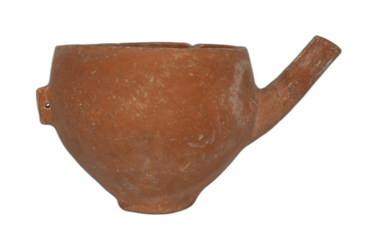 Pottery milk-bowl in Red Polished I ware pottery; hand-made; hemispherical body tapering to flat base with a tubular spout from the mid-body; vertical lug horizontally pierced; medium red-brown surface; slipped and polished. Dimensions: Diameter: 13 centimetres; Height: 8.50 centimetres Object Type: bowl Ware: Red Polished Ware Series: Red Polished I-II (north coast) (Stewart type XIII Da) Techniques: pierced