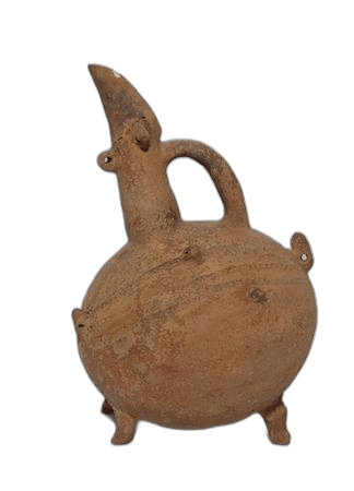 Pottery zoomorphic (animal-shaped) jug in red Polished ware; hand-made; spherical-ovoid barrel-shaped body on four feet (one damaged); tall tubular spout with a cutaway mouth; vertical handle arching from nody to base of mouth; seven lugs with 'string-holes', including on in the 'tail' position; made of buff-orange clay covered with a red polished slip and decorated with raised bands and incised strokes; surface very worn and chipped in places. Dimensions: Height: 23 centimetres Object Type: jug Ware: Red Polished Ware (RP III) Techniques: incised; polished; slipped; handmade
