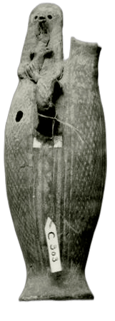 White Painted ware bottle/flask with applied terracotta figurine; hand-made; oval body on a low conical base; spout on the side of the vessel, with a ring handle on the front; on the shoulder is a human figure with right hand at the chin. Made of cream colouted clay decorated with blacl paint: vertical wavy lines framed by straight one on the front and back, with lattices in between; rings on the neck and foot; horizontal lines on the figurine. Dimensions: Height: 15.24 centimetres Object Type: bottle Ware: White Painted Ware (WP V) Series: SCE type (WP V, X D E 1a) Techniques: painted