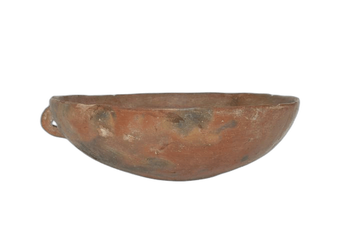 Pottery bowl in Red Polished ware; hand-made; hemispherical body on a rounded base; simple loop handle or string hole placed just below the rim. Made of buff clay with a burnished surface, fired red with black mottled patches across the body. Dimensions: Height: 9 centimetres Object Type: bowl Ware: Red Polished Ware Series: Stewart Type (Part 4, p. 84. XV F type b); Red Polished IV Techniques: handmade; burnished