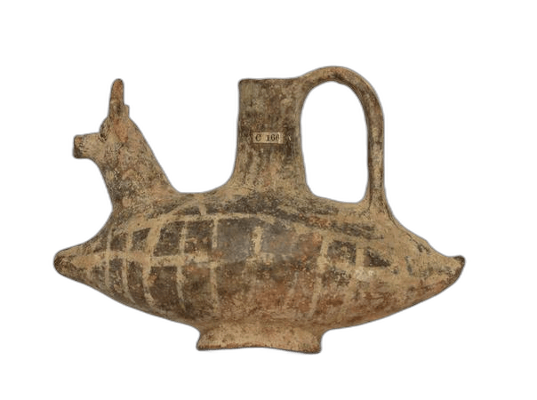 Pottery bull askos in Base Ring II ware; hand-made; elongated elliptical body with pointed ends on an oval ring base; the surface, including spout and neck of protome, has been shaved with a tool; tall cylindirical spout, with slighly concave sides, rising from the centre of the body; single vertical handle arching from body to rim of spout; bull's head protome on the end of the vase: hollow spout, pellet eyes, plain horns and ears (one of the latter is missing); made from orange-buff clay fired black-red and painted in white with a chequer pattern on the body. Dimensions: Height: 10.50 centimetres Object Type: askos Ware: Base Ring Ware Series: Base Ring II Techniques: painted; handmade; shaved
