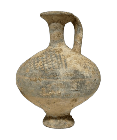 Pottery juglet in Proto-White Painted ware; depressed-globular body (almost biconical) on a conical base; narrow neck flaring upwards to a trumpet mouth with rounded rim; vertical handle from shoulder to rim; buff-cream clay and slip, decorated in matt black paint: broad bands and cross-hatched triangles on the body and shoulder, solid foot, bands on neck; surface heavily calcinated. Dimensions: Height: 12.70 centimetres Object Type: juglet Ware: Proto-White Painted Techniques: painted; wheel-made; slipped