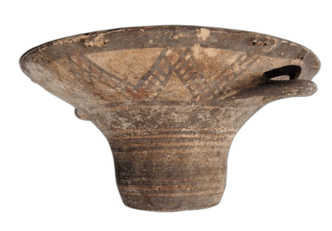 Pottery basket-shaped bowl or kalathos in Bichrome ware; wheel-made; cylindrical body with a pronounced flare and everted rim; flat base; pairs of triangular-shaped piercings at intervals around the rim; pair of opposing horizontal loop handles; made of buff clay, decorated in matt brown paint on a cream-buff surface (possibly the result of firing rather than a actual slip): bands and hatched zig-zags inside and out. Dimensions: Diameter: 26 centimetres Object Type: bowl Ware: Bichrome Ware (BiCh I) Techniques: painted; pierced; wheel-made; slipped