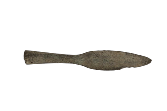 Bronze spear-head; cast; leaf-shaped blade with a flattened midrib; relatively short tubular open socket, with two opposed perforations at the base of the socket. Dimensions: Length: 17 centimetres max Object Type: spear-head Techniques: cast