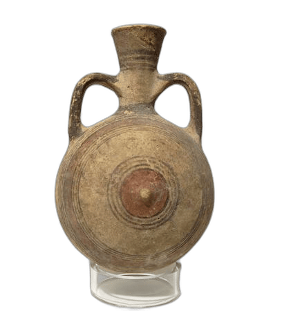 Pottery lentoid flask in Bichrome III ware; flattened spherical body with a prominent nipple on each side in the centre; narrow neck with a flaring mouth; two arching handles from shoulder to neck; buff clay and slip, decorated in black and red paint: concentric circles on each side of the body with a bull's eye motif decoration in the centre, solid handles, bands on the neck, including a broad red band below the lip. Dimensions: Height: 13.30 centimetres Object Type: flask Ware: Bichrome Ware Series: Bichrome III Techniques: painted; wheel-made; slipped