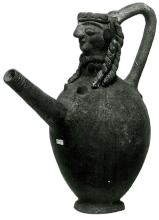 Pottery spouted jug in Bichrome Red ware; wheel-made with applied details; ovoid body on a hollow pedestal base; long tubular spout rising at an angle from mid- body, pair of breasts above; the neck is modelled in the form of a female head, with applied details such as pellet eyes and curls and pairs of plaited tresses hanging down each side of the face; she wears a double choker around her neck, also formed of applied discs of clay; single arching handle from the shoulder to the rop of the female head. Made of buff clay decorated with black and red paint. Dimensions: Height: 21.59 centimetres Object Type: jug Ware: Bichrome Red Ware Techniques: wheel-made; applied; painted