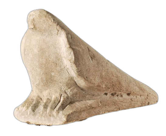 Whiteish grey limestone falcon. Smaller chipped areas on back, head and wings. On a rectangular plinth a falcon with his wings close to the body is sitting, the small head is rendered summarily. The claws are large; the surface is smooth and without any indications of feathers and the like. The wings are separated from the body by means of a stepped dent. Dimensions: Height: 6 centimetres; Width: 9.50 centimetres Object Type: figure Series: Nick Type 4 (Sub group 4.2)