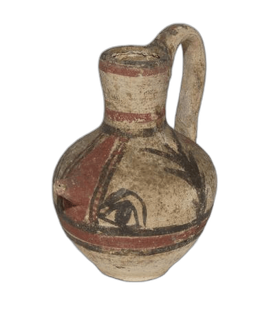 Pottery jug in Bichrome ware; wheel-made; globular-biconical body on a slightly raised, concave beneath; tall cylindrical neck with plain, incurving rim; short conical spout at the shoulder; high looped handle from shoulder to rim; pale buff clay and slip, decorated in red and black paint: horizontal bands around the lower body and neck, pair of eyes flanking the spout on the shoulder, stylised trees on the shoulder, red stripe with short bars at intervals on the handle, irregular patch of purple-black paint behind spout, flanked by two ladder motifs. Dimensions: Height: 14.80 centimetres Object Type: oinochoe; jug Ware: Bichrome Ware (Bichrome V) Techniques: painted; slipped; wheel-made