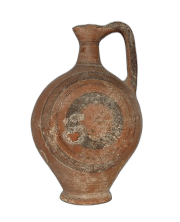 Pottery jug in Bichrome-Red ware; wheel-made; globular body on a low foot; tall narrow neck with trefoil mouth; single handle arching from shoulder to rim; buff clay and matt red slip, decorated with black and white paint: bands of broad and narrow concentric circles on both sides, rings around the neck, black ladder pattern on handle, two groups of small concentrics below the spout. Dimensions: Height: 24.60 centimetres Object Type: jug Ware: Bichrome Red Ware (BiCh Red II (V)) Techniques: painted; wheel-made