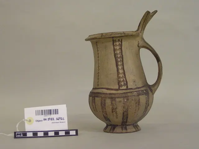 White Slip tankard with double-horned handle Dimensions: 22cm (height) Reference URL: https://collections.ashmolean.org/object/308267 Object Type: stimulant or narcotic equipment > alcohol equipment > tankard; container > vessel