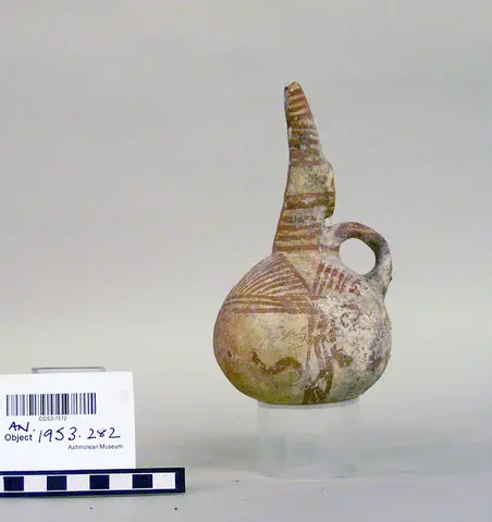 White Painted juglet with beaked spout Dimensions: 15.6cm (height)8.7cm of body. (diameter) Reference URL: https://collections.ashmolean.org/object/309310 Object Type: container > vessel > jug > juglet