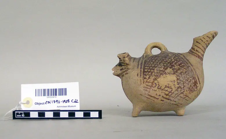 White Painted V zoomorphic vessel with bull-protomel Dimensions: 11.1cm (height)7.7cm (width)14.6cm (length) Reference URL: https://collections.ashmolean.org/object/304215 Object Type: container > vessel > vase