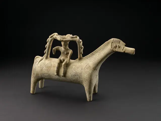 Terracotta horse rhyton with rider as part of handle on back Dimensions: c. 22.5cm (height)c. 36.5cm (length) Reference URL: https://collections.ashmolean.org/object/304649 Object Type: stimulant or narcotic equipment > alcohol equipment > rhyton