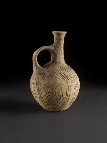 Black Slip II or III juglet Dimensions: 11.9cm (height)7.7cm (diameter) Reference URL: https://collections.ashmolean.org/object/304306 Object Type: container > vessel > jug > juglet