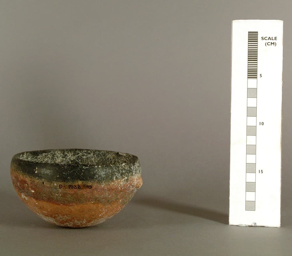 Red Polished ware bowl; Deep bowl with round base and inturned rim with small knob on rim above unpierced knob lug Media/Materials: ceramic