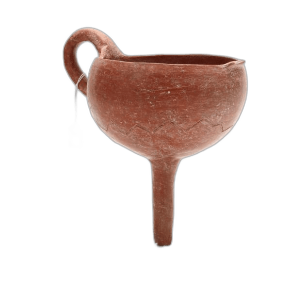 Cypriot Early Bronze Age Polished Red Ware Funnel, circa 2000 B. C. , bowl form with one handle, one register of incised zig-zag decoration with remnants of white fill. Presented on a custom lucite stand. 6 in. A rare and fragile form. Tiny chips at funnel mouth, else intact. Sale Price: $1,400