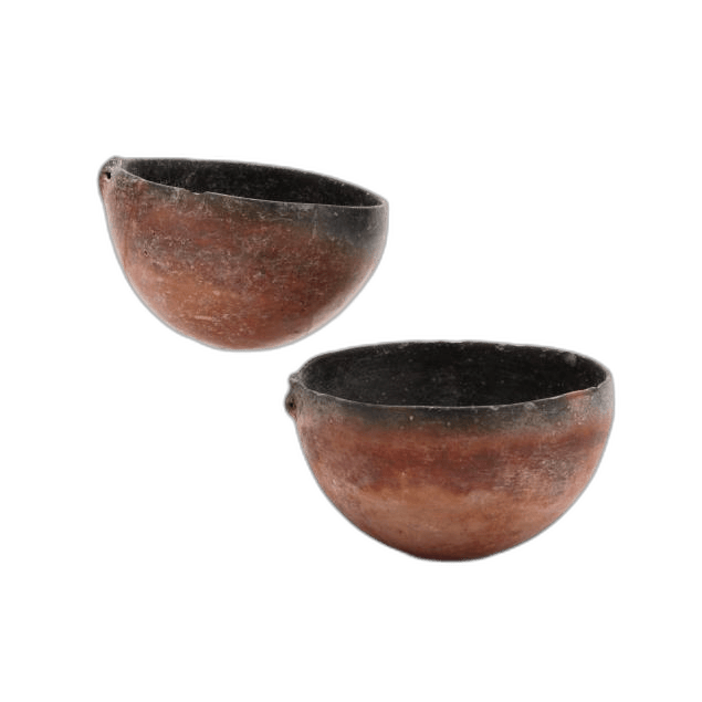 Two Cypriot Bronze Age Polished Red Ware Bowls, 2nd millenium B. C. , both with black interior and pierced lug handle. Diameters 4. 75 in. and 4. 5 in. The smaller bowl repaired with visible hairlines; both with minor rim chips. Sale Price: $130
