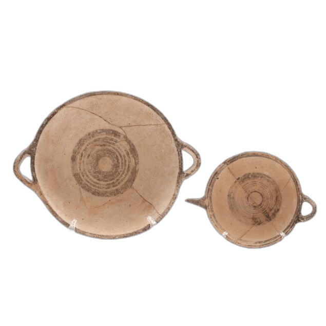 Two Cypro-Geometric Dishes, circa 1050-750 B. C. , both with handles and a shallow flat base, the interiors decorated with concentric circles; the undersides have additional bands around the base, which features latticed geometric shapes; the larger dish also sports four swastika patterns on the base. The larger dish 12. 25 in. with handles; the smaller dish is 8. 75 in. with handles Both pieces restored from four pieces; expected aging and wear to surfaces. Sale Price: $325