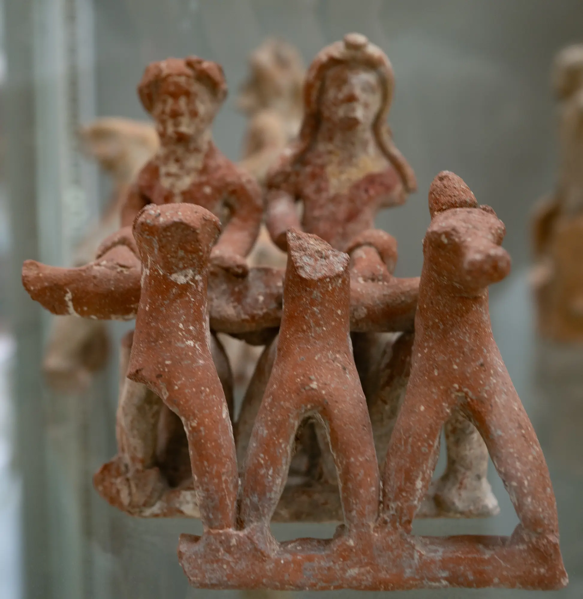 Chariot group with 3 horses and two riders, red terracotta.