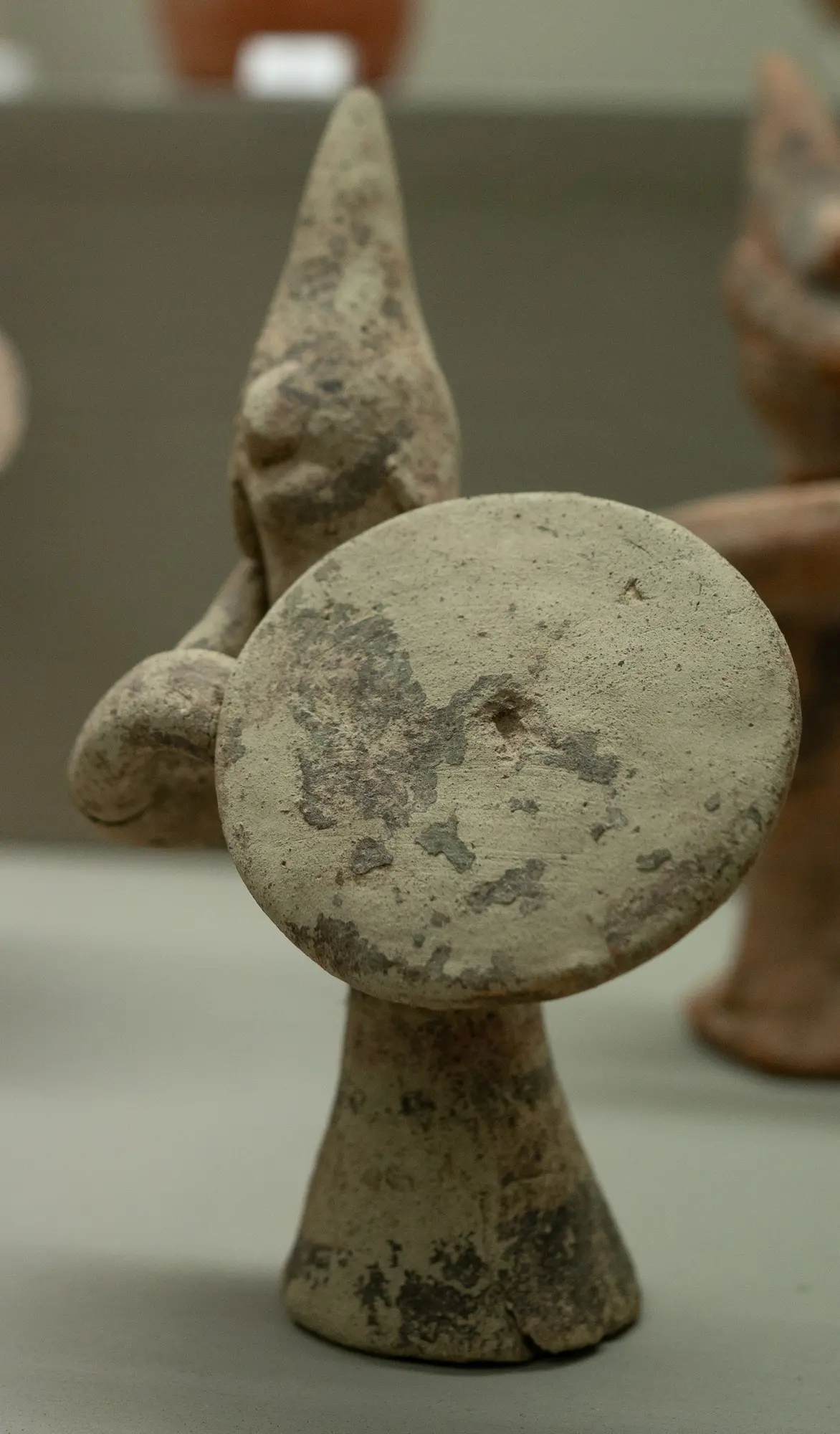 small terracotta warrior with helmet, shield and spear